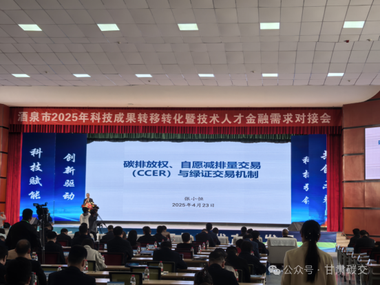 4月23日,酒泉市2025年科技成果转移转化暨技术人才金融需求对接会隆重召开。甘肃碳交副总经理张小恒受邀出席,围绕“碳排放权、自愿减排量交易与绿证交易机制”发表主旨演讲,为区域绿色低碳发展提供创新思路。